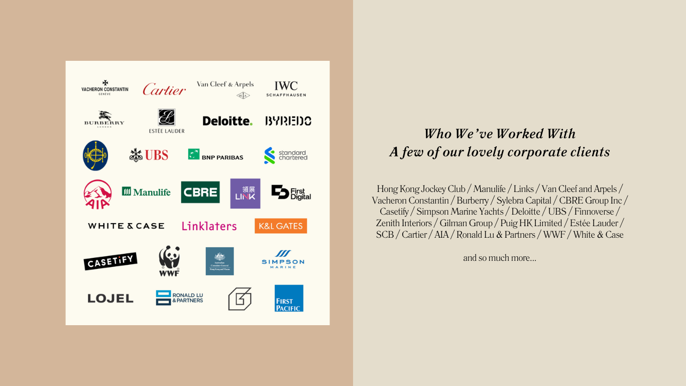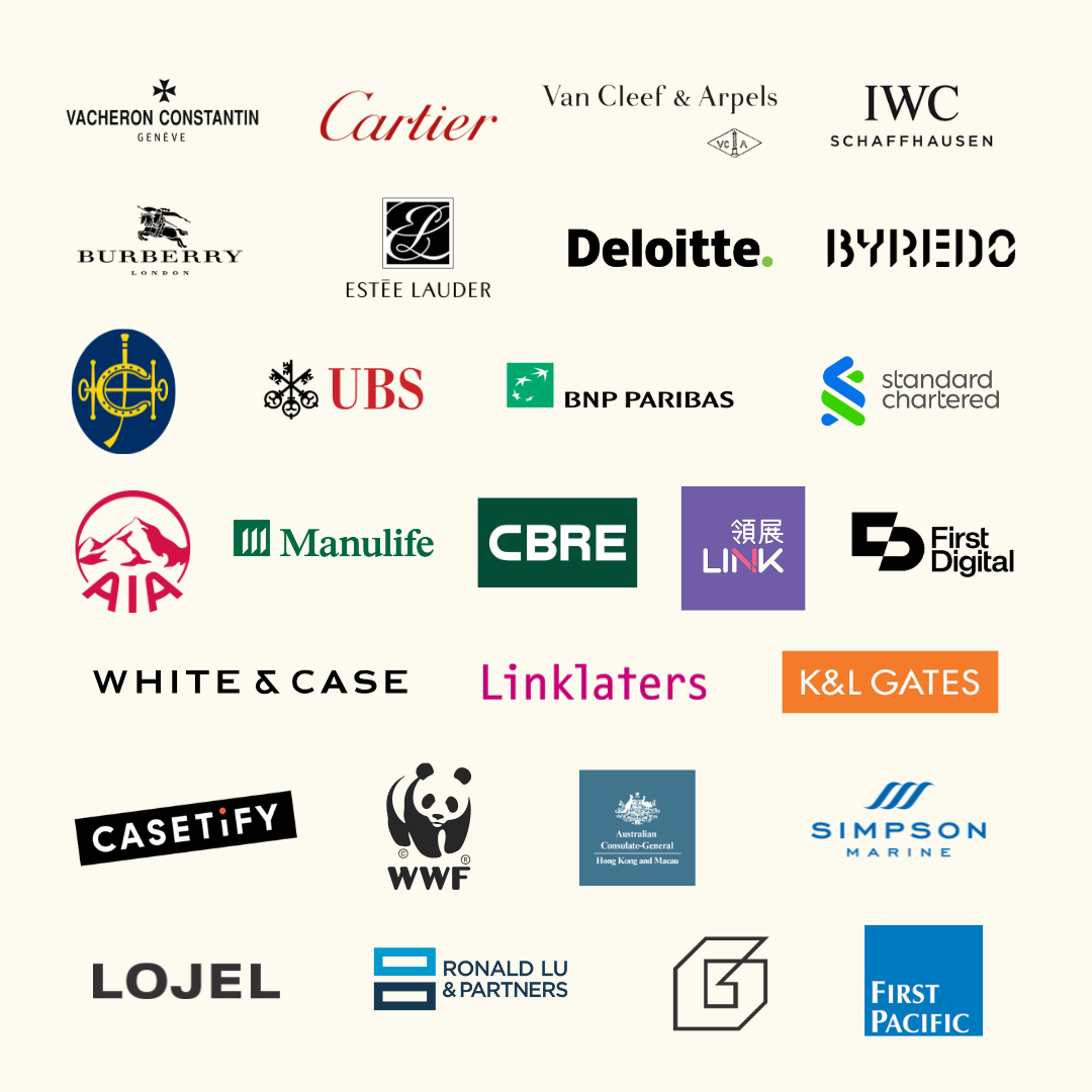 Hong Kong Jockey Club / Manulife / Links / Van Cleef and Arpels / Vacheron Constantin / Burberry Sylebra Capital / CBRE Group Inc / Casetify / Simpson Marine Yachts / Deloitte / UBS / Finnoverse / Zenith Interiors / Gilman Group / Puig HK Limited / Estรฉe Lauder / SCB / Cartier / AIA / Ronald Lu & Partners / WWF / White & Case / First Pacific / First Digital / K&L Gates / Linklaters / IWC / BNP Paribas